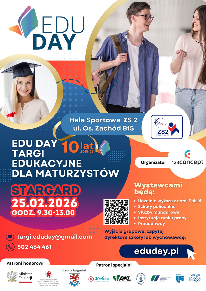 Juz w najbiższą środę, 25 lutego 2026 roku, w hali sportowej Zespołu Szkół nr 2 w godz. 9.30-13.00 odbędzie się kolejna edycja Targów Edukacyjnych dla maturzystów EDU DAY 2026.