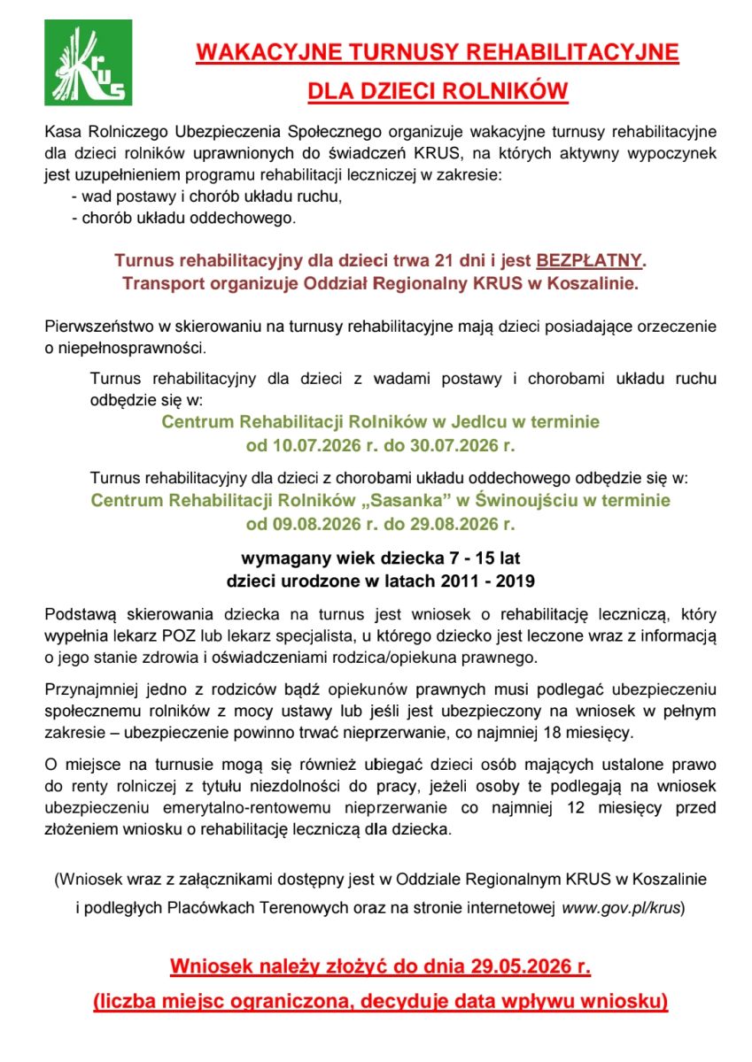 Turnus rehabilitacyjny dla dzieci trwa 21 dni i jest BEZPŁATNY. Wniosek należy złożyć do dnia 29.05.2026 r. (liczba miejsc ograniczona, decyduje data wpływu wniosku)