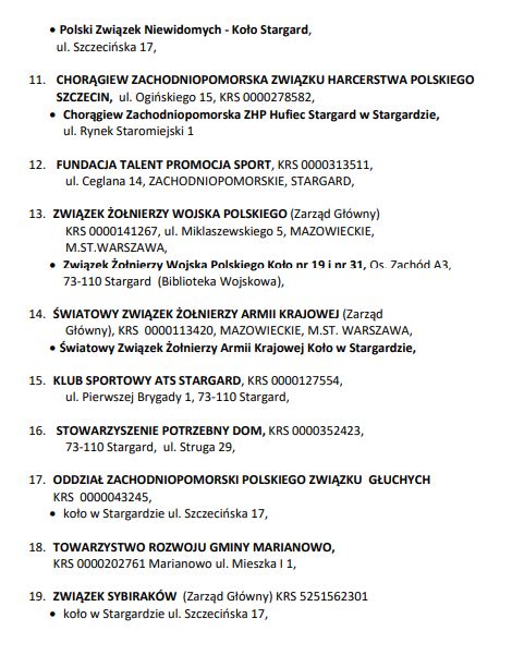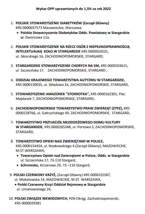Lista organizacji z Powiatu Stargardzkiego, na które można przekazać 1,5%