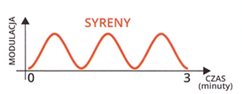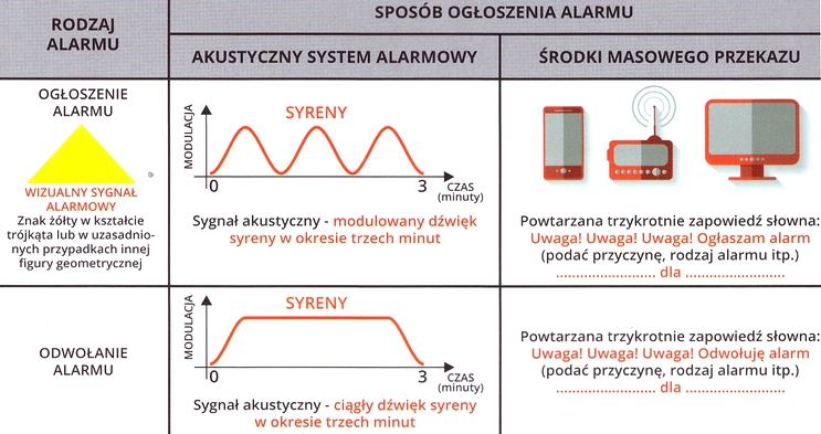 Alarm dla ludności cywilnej: Sygnał akustyczny – modulowany dźwięk syreny alarmowej trwający trzy minuty lub Powtarzana trzykrotnie zapowiedź słowna: Uwaga! Uwaga! Uwaga! Ogłaszam alarm ………… (podać przyczynę, rodzaj zagrożenia itp.) dla …………
