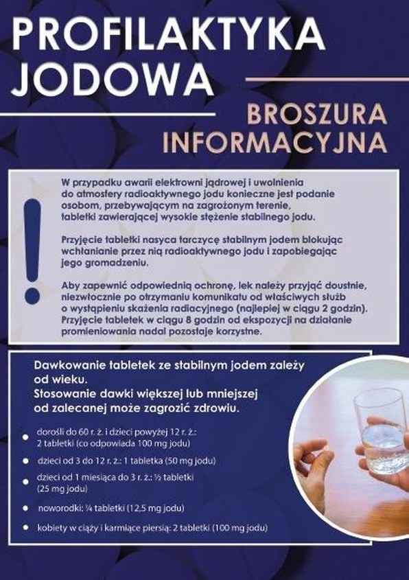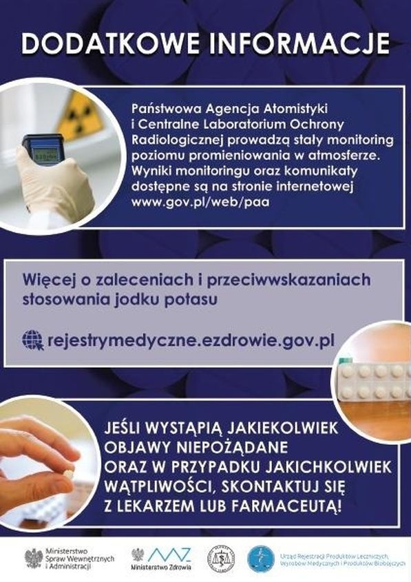 Uwaga! Tabletki wydawane będą mieszkańcom tylko i wyłącznie w momencie ogłoszonego zagrożenia (niezależnie od pory dnia czy nocy) i wydania przez Ministra Spraw Wewnętrznych i Administracji stosownej decyzji. Będą je wtedy mogli pobrać wszyscy mieszkańcy Powiatu oraz osoby w nim przebywające.
