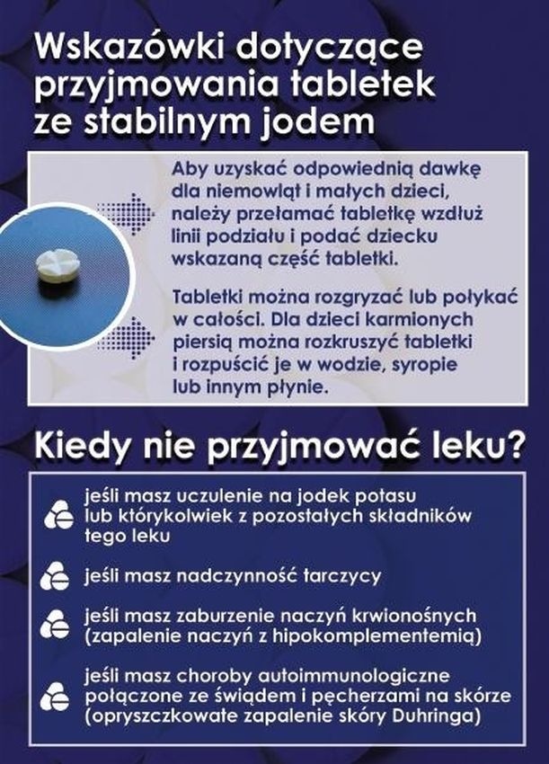 Dawkowanie tabletek ze stabilnym jodem, który blokuje wchłanianie radioaktywnego jodu, jest zależne od wieku: