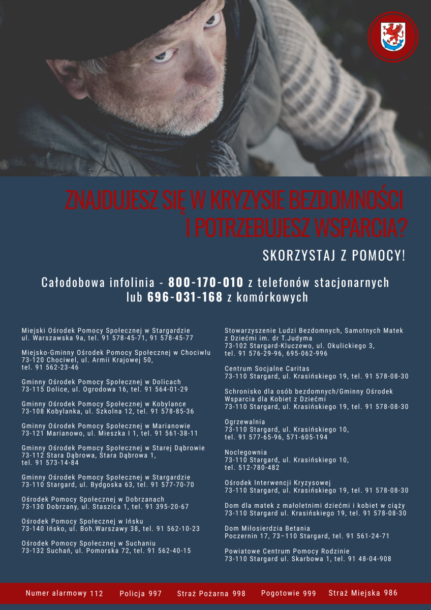 W związku z okresem zimowym oraz prognozowanymi opadami śniegu oraz silnego mrozu informujemy, że na terenie Powiatu Stargardzkiego główną placówką prowadzącą ogrzewalnię, noclegownię i schronisko dla osób bezdomnych jest Caritas Archidiecezji Szczecińsko-Kamieńskiej. Wsparcie można uzyskać, kontaktując się bezpośrednio z placówkami lub dzwoniąc na numery alarmowe.